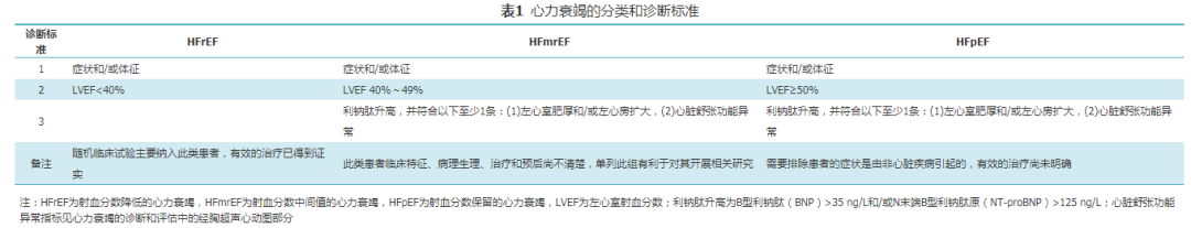 心衰的诊断和评估依赖于病史、体格检查、实验室检查、心脏影像学检查和功能检查。慢性心衰诊断流程见图1。首先,根据病史、体格检查、心电图、胸片判断有无心衰的可能性;然后,通过利钠肽检测和超声心动图明确是否存在心衰(诊断标准见表1),再进一步确定心衰的病因和诱因;最后,还需评估病情的严重程度及预后,以及是否存在并发症及合并症。全面准确的诊断是心衰患者有效治疗的前提和基础。